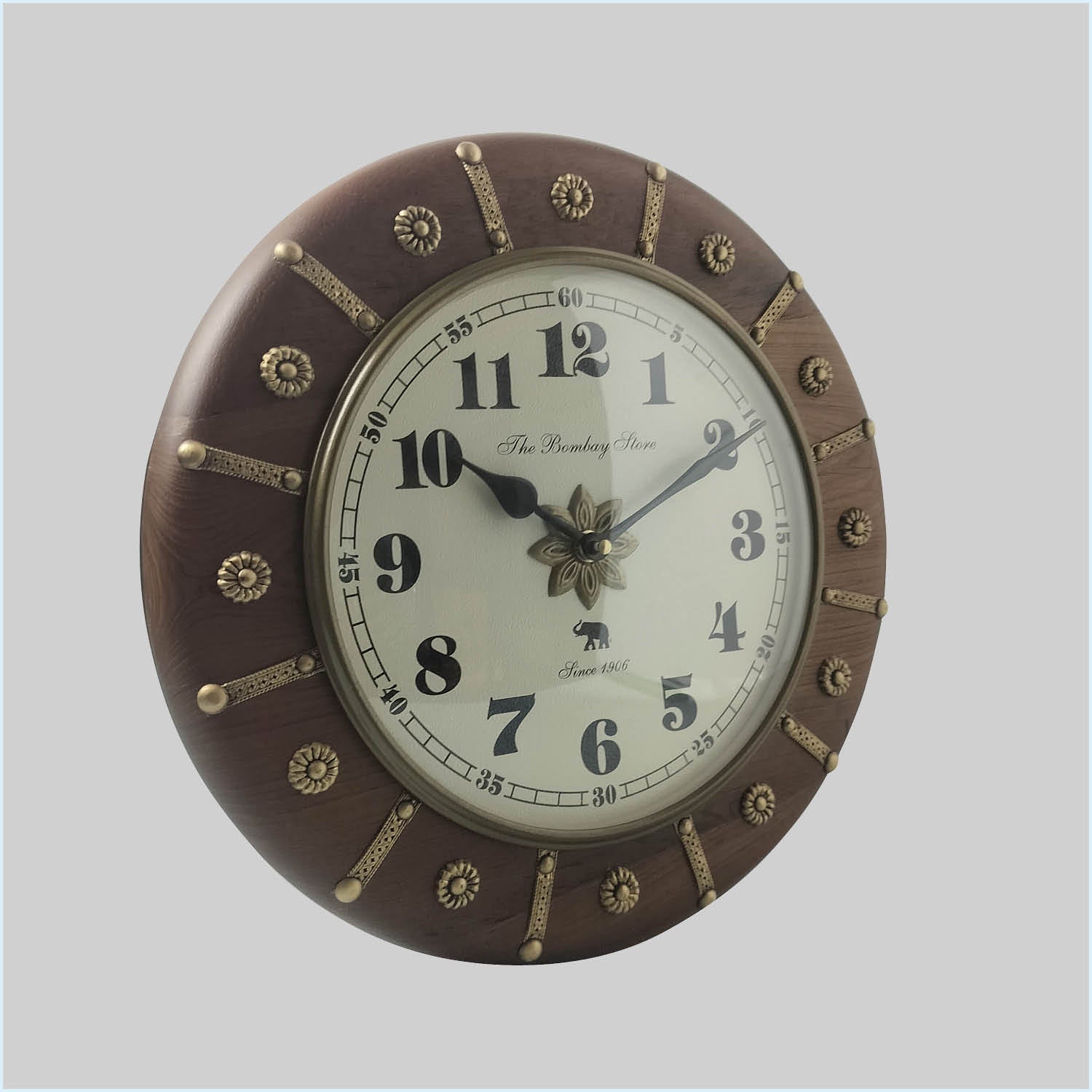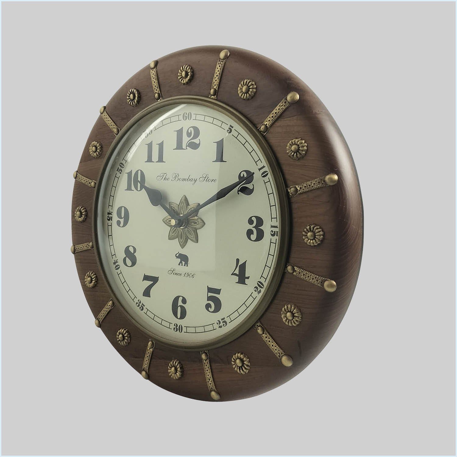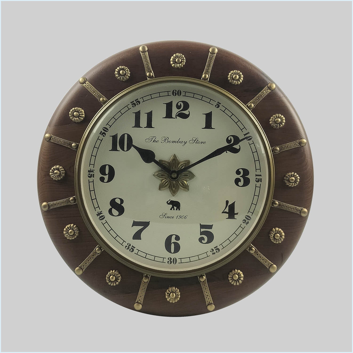 Teak Wood Round Wall Clock with Brass Accents 12 in x 2 in x 12 in