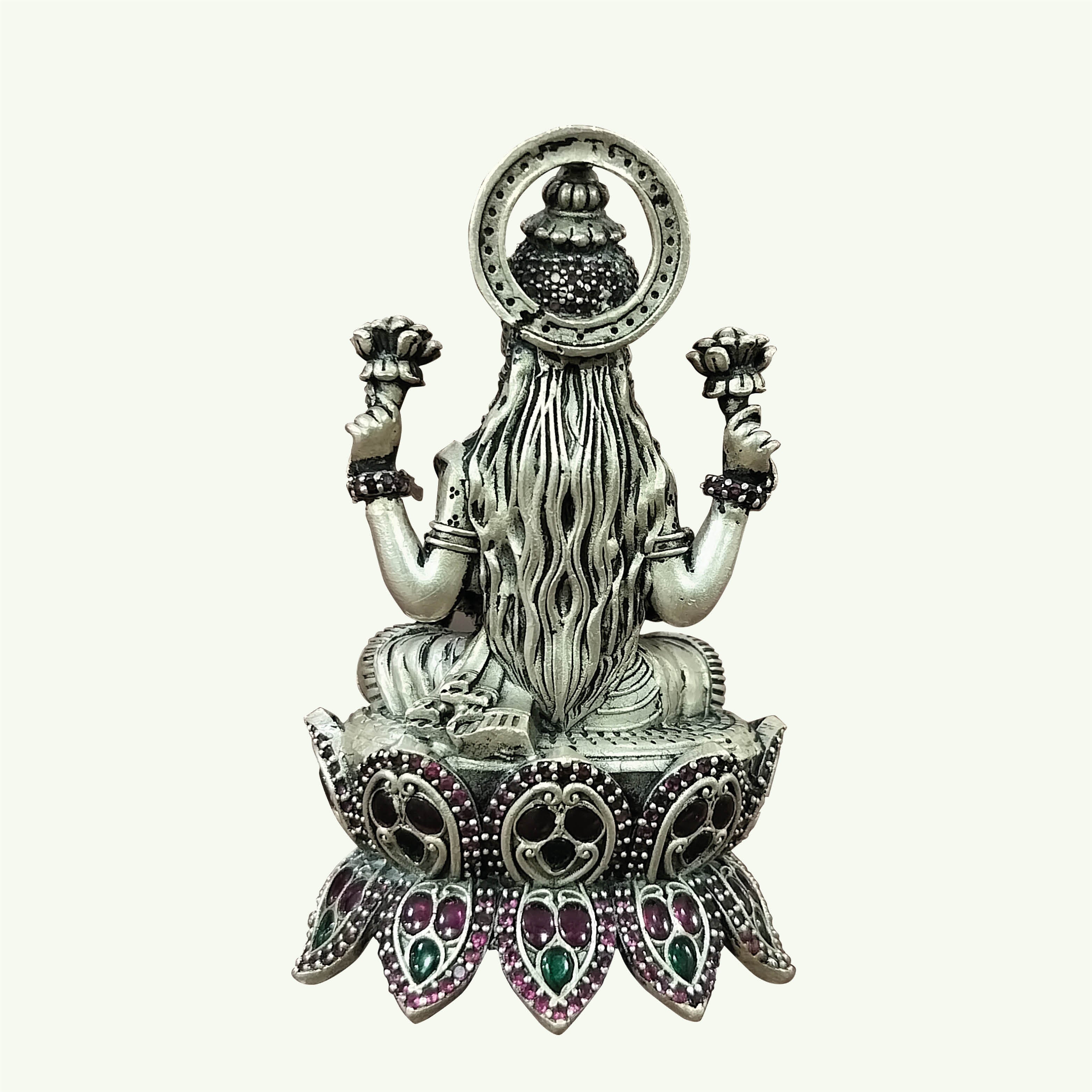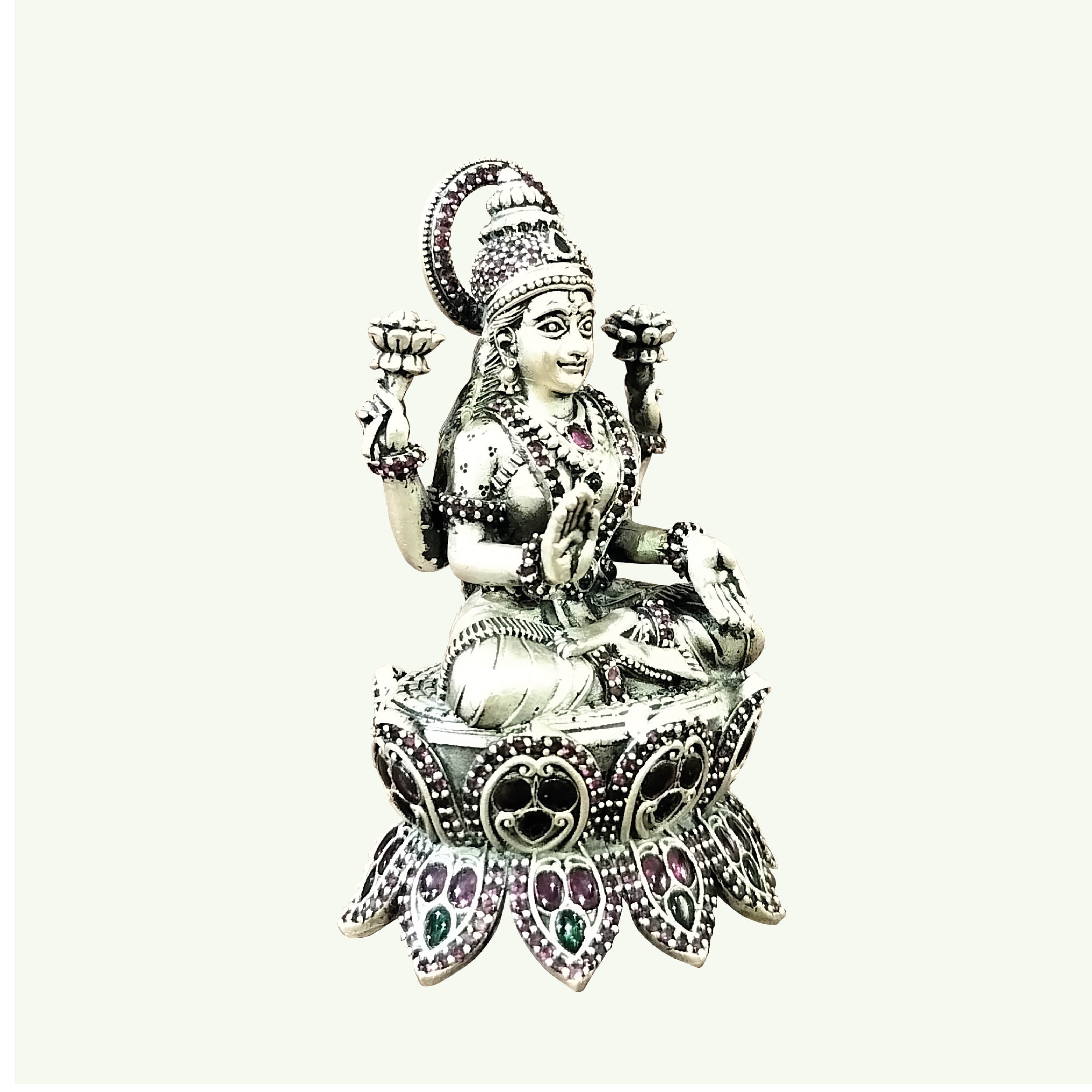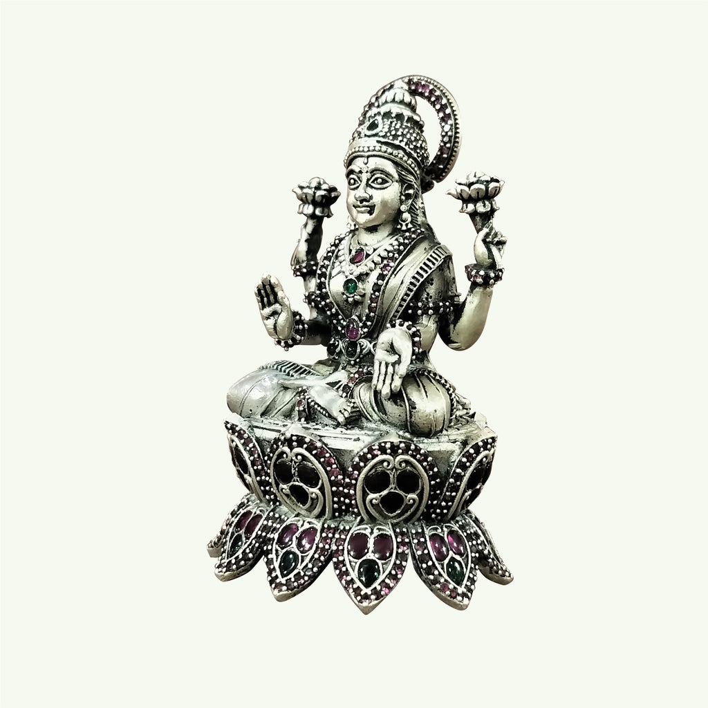 Silver Laxmi Sitting on Lotus Decorated with Stonework 106 gm
