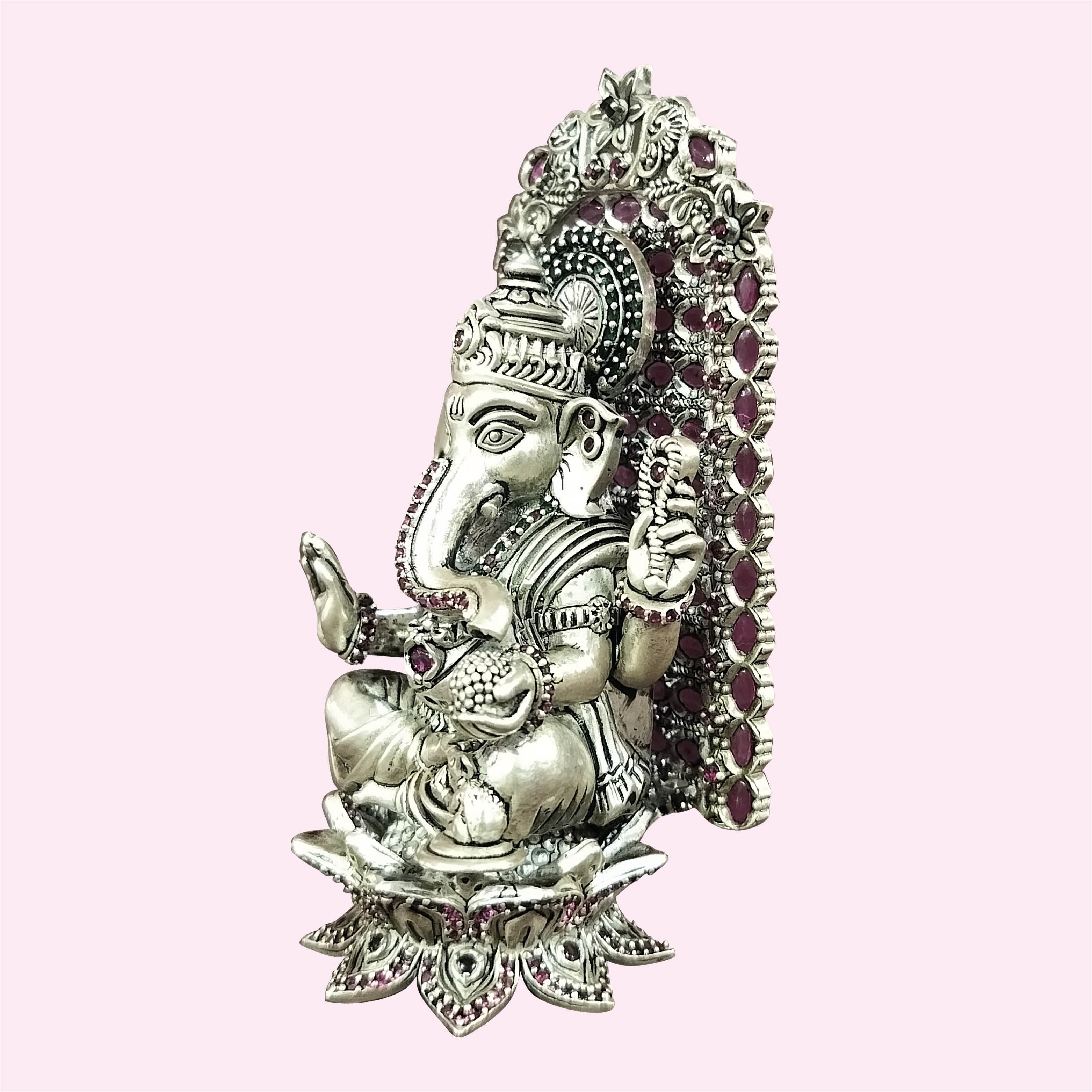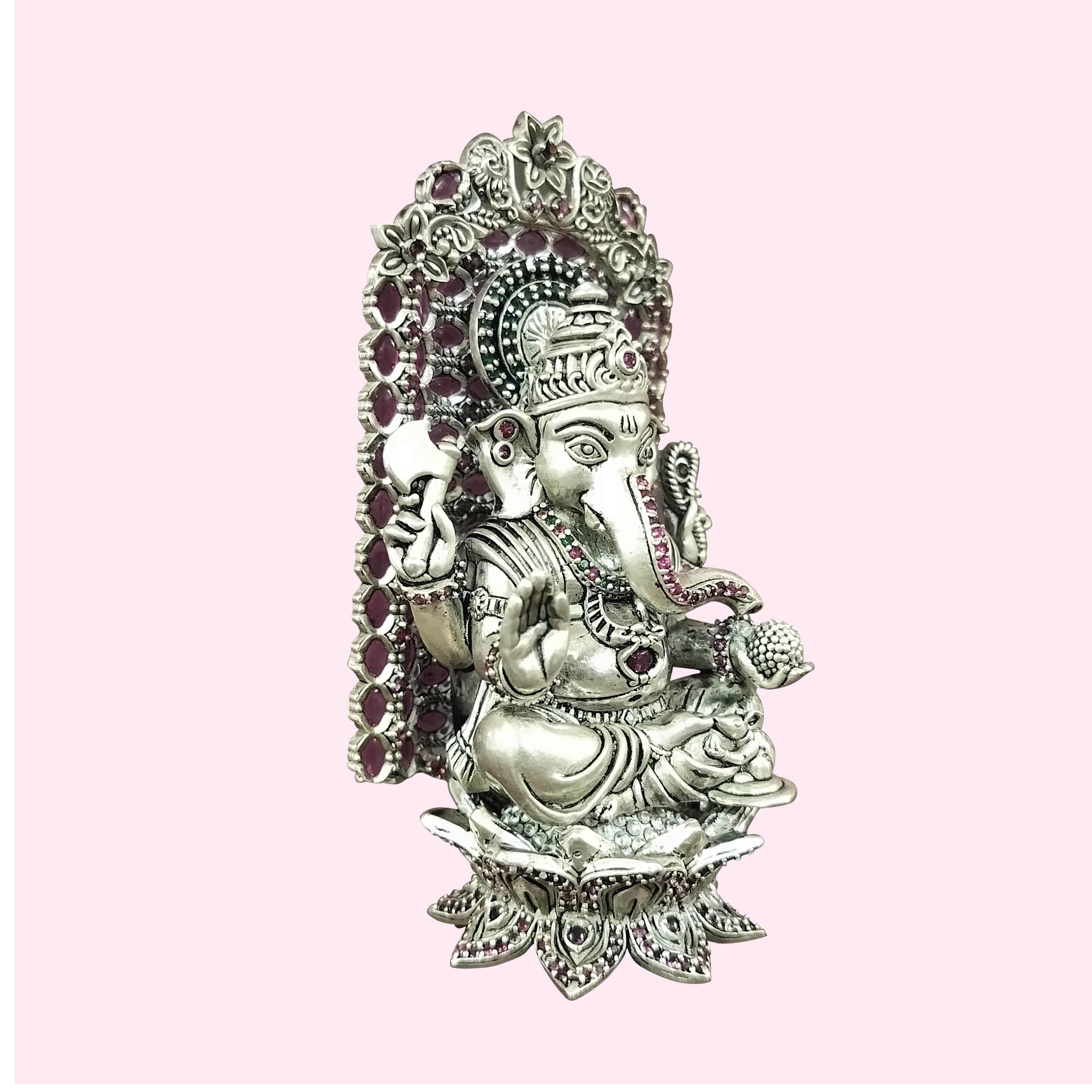 Silver Ganesh on Lotus Decorated with Stonework 200 gm