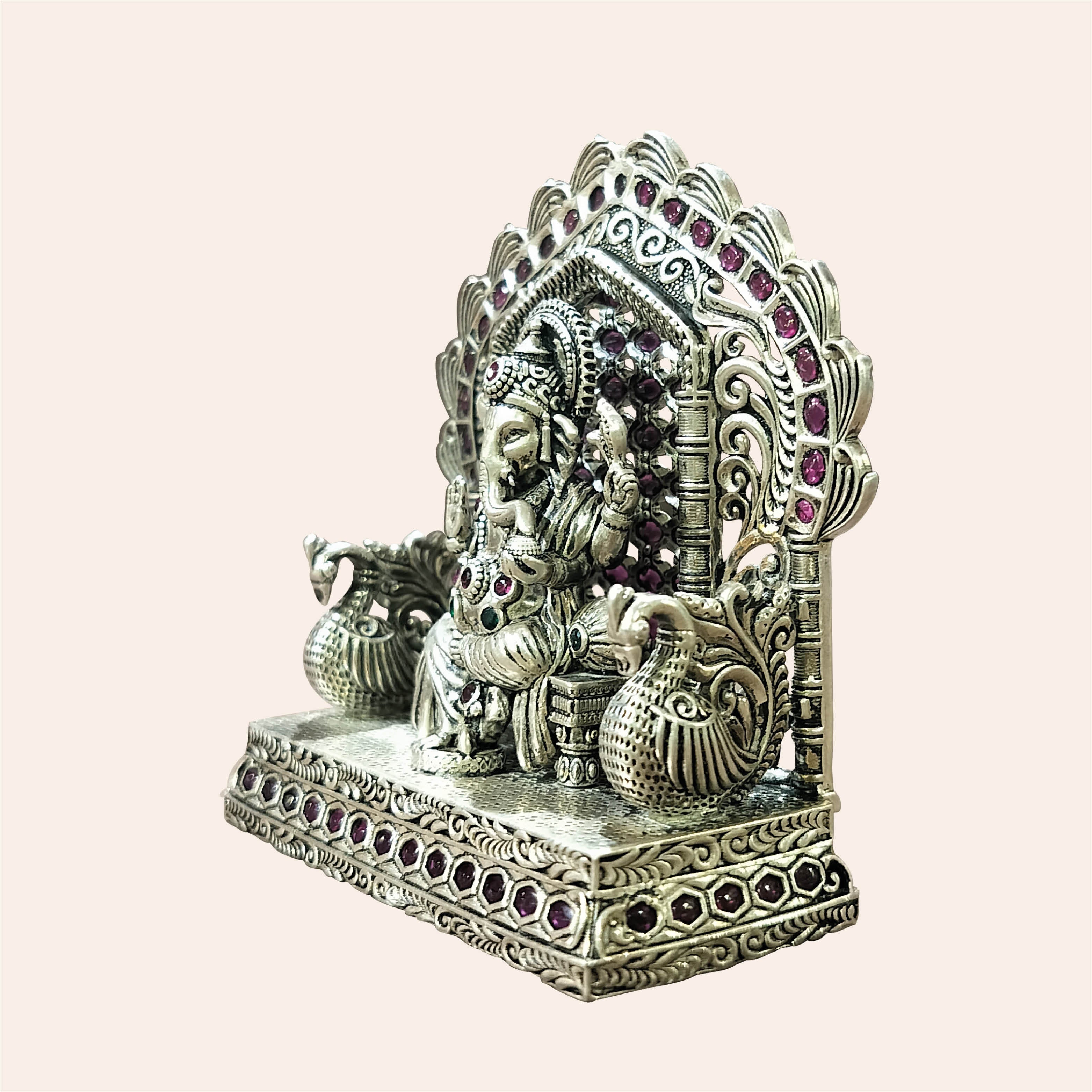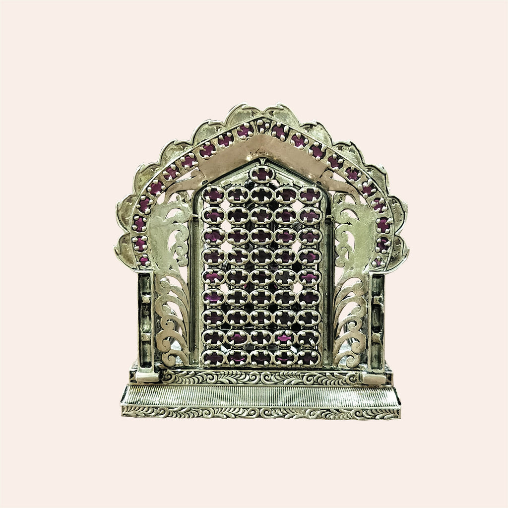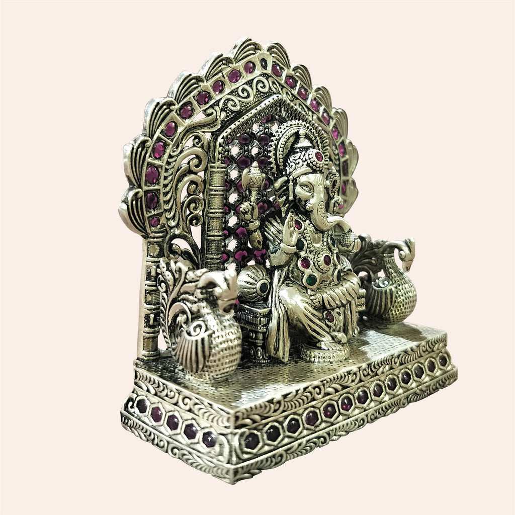 Silver Ganesh Sitting in Arch Decorated with Stonework 146 gm