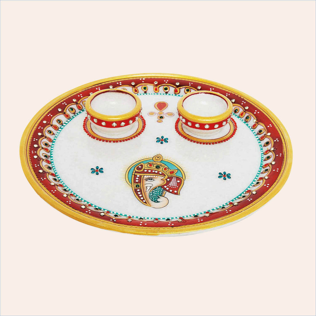 Marble Plate for Puja with Handpainted Ganesha and Two Diyas - 9 in