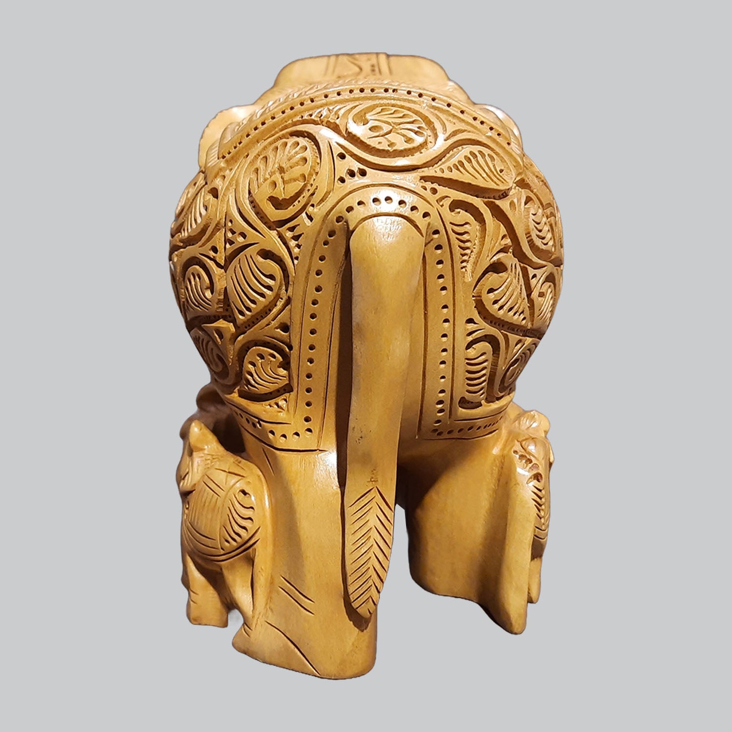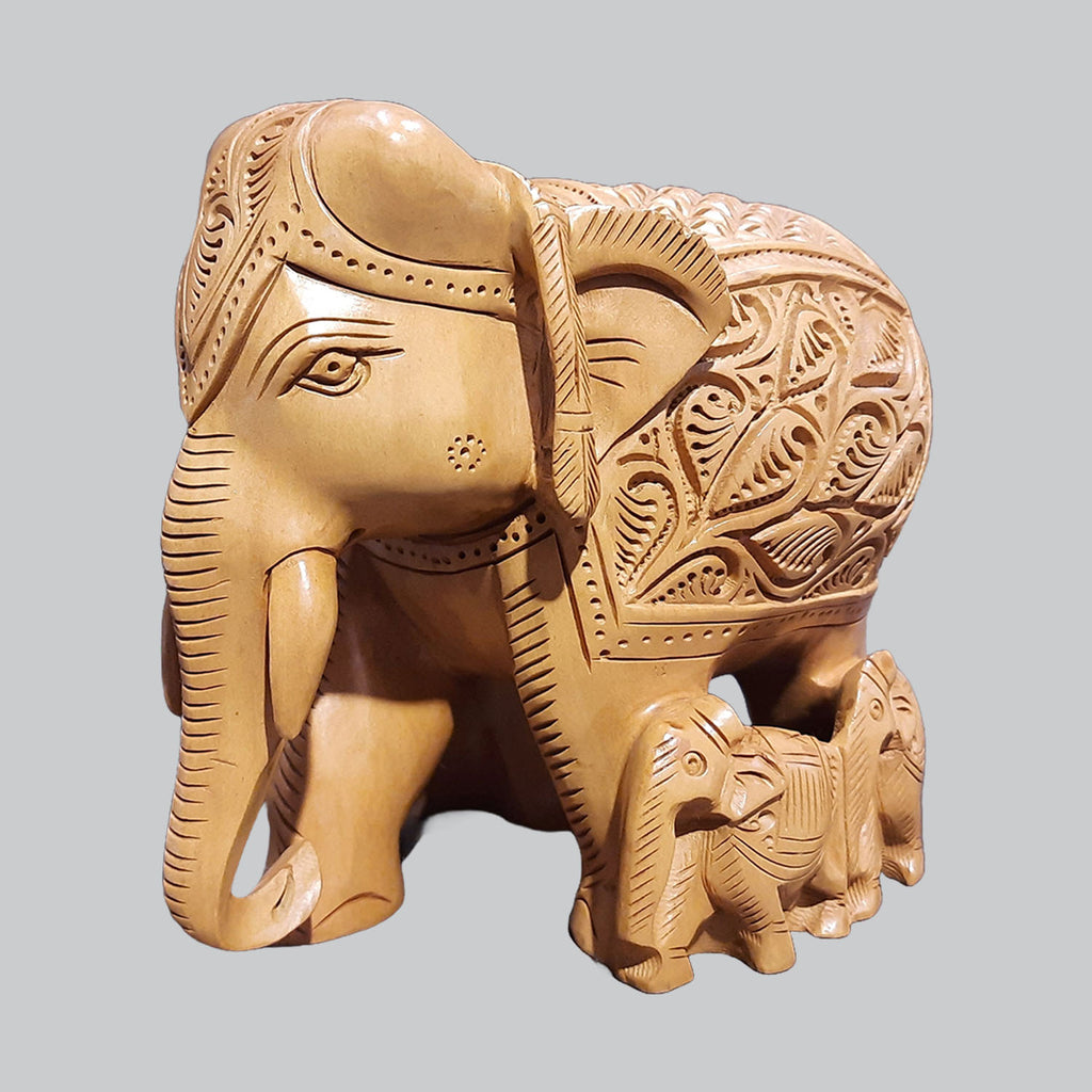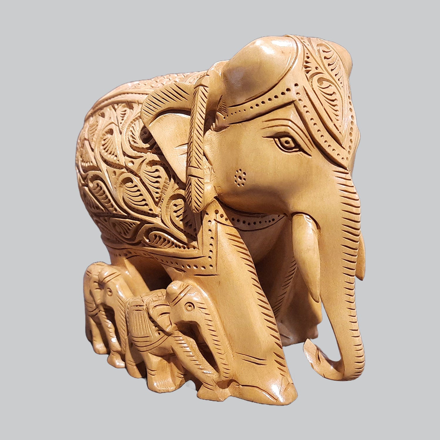 Kadam Wood Elephant Family with Carving Down Trunk 5 in