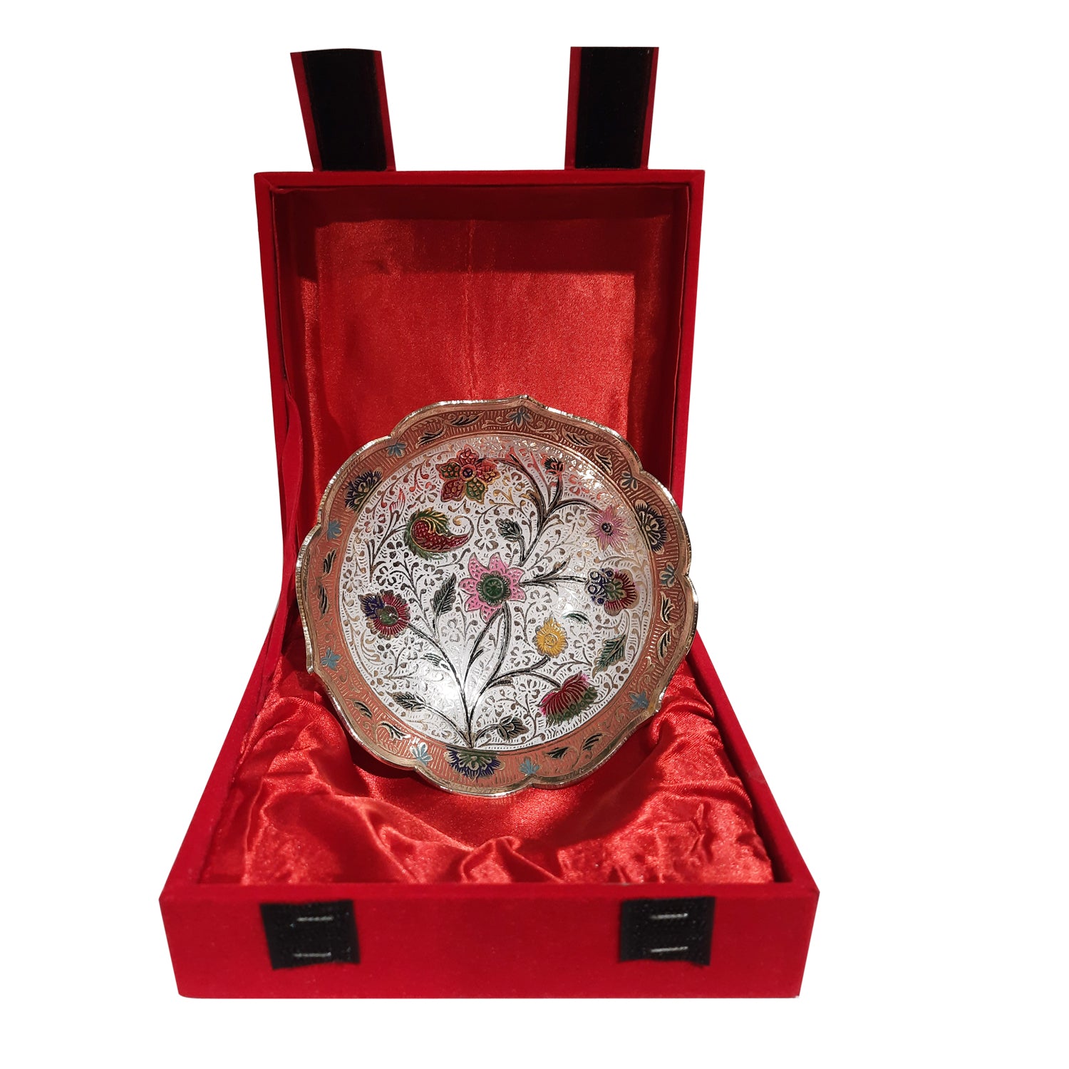 History of this Antique Art.Introduced in Rajasthan by Raja Maan singh of Amer, this Persian craft was originally used to create designs on the back of traditional polki jewellery. However, as the craft flourished under Mughal patronage, it became a design of its own, and pervaded into showpieces and tableware.One of the most complex crafts, the process of Meenakari remains the same as it was 500 years ago! A typical piece passes through the hands of 7 craftsmen before it’s finally ready for showcase.