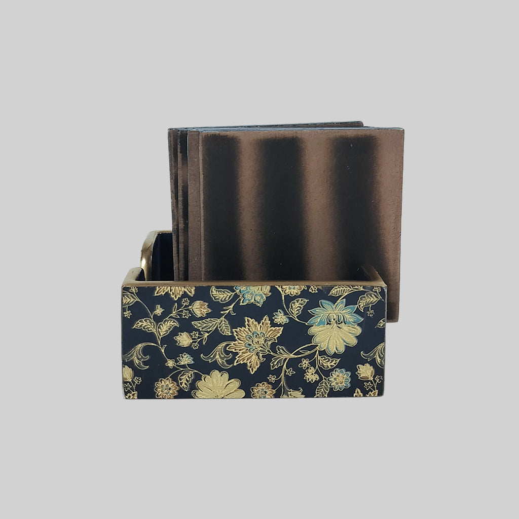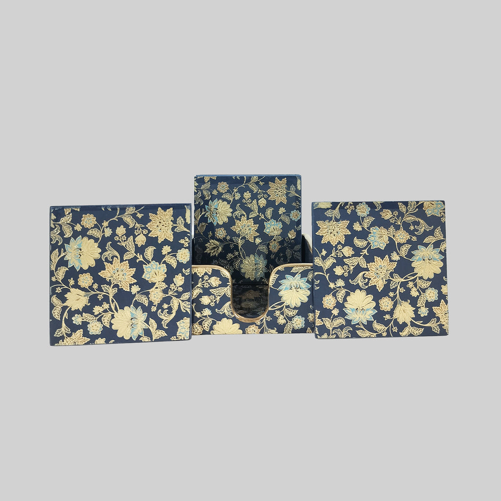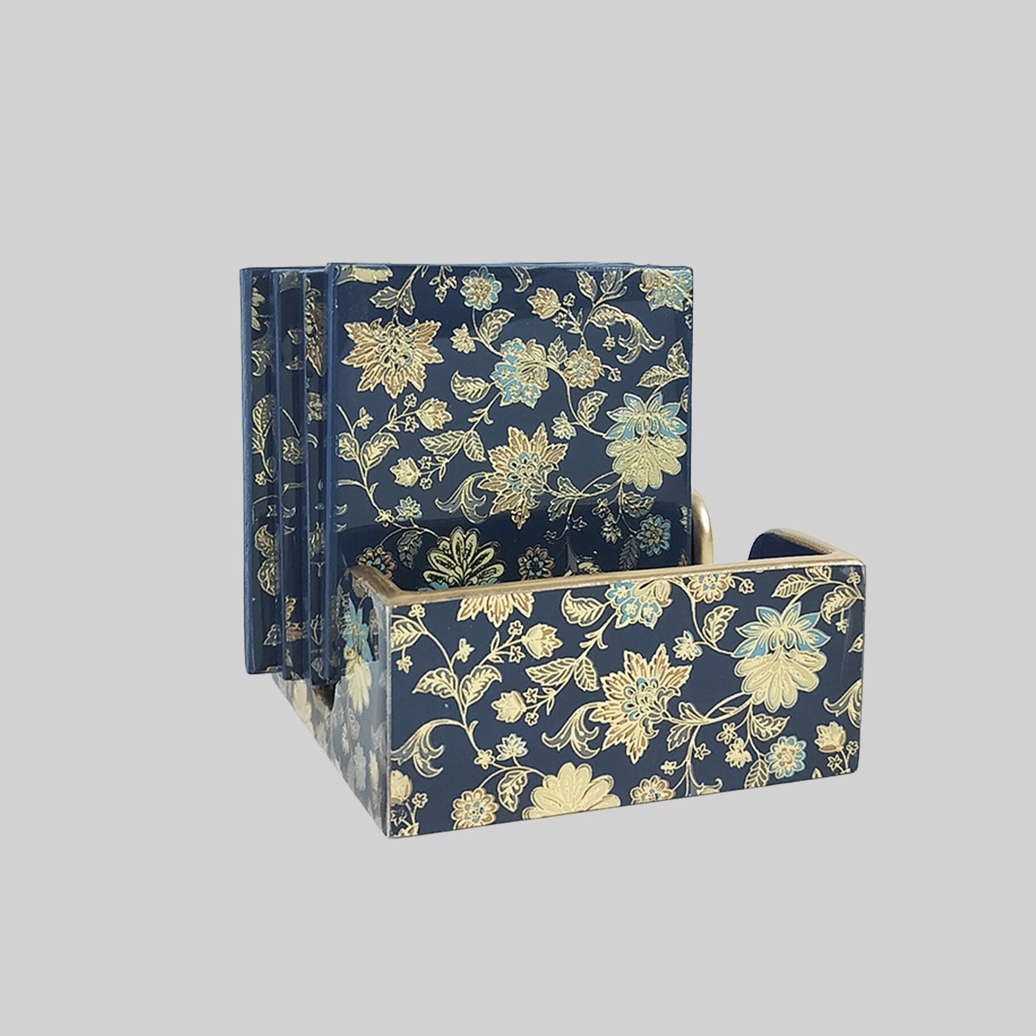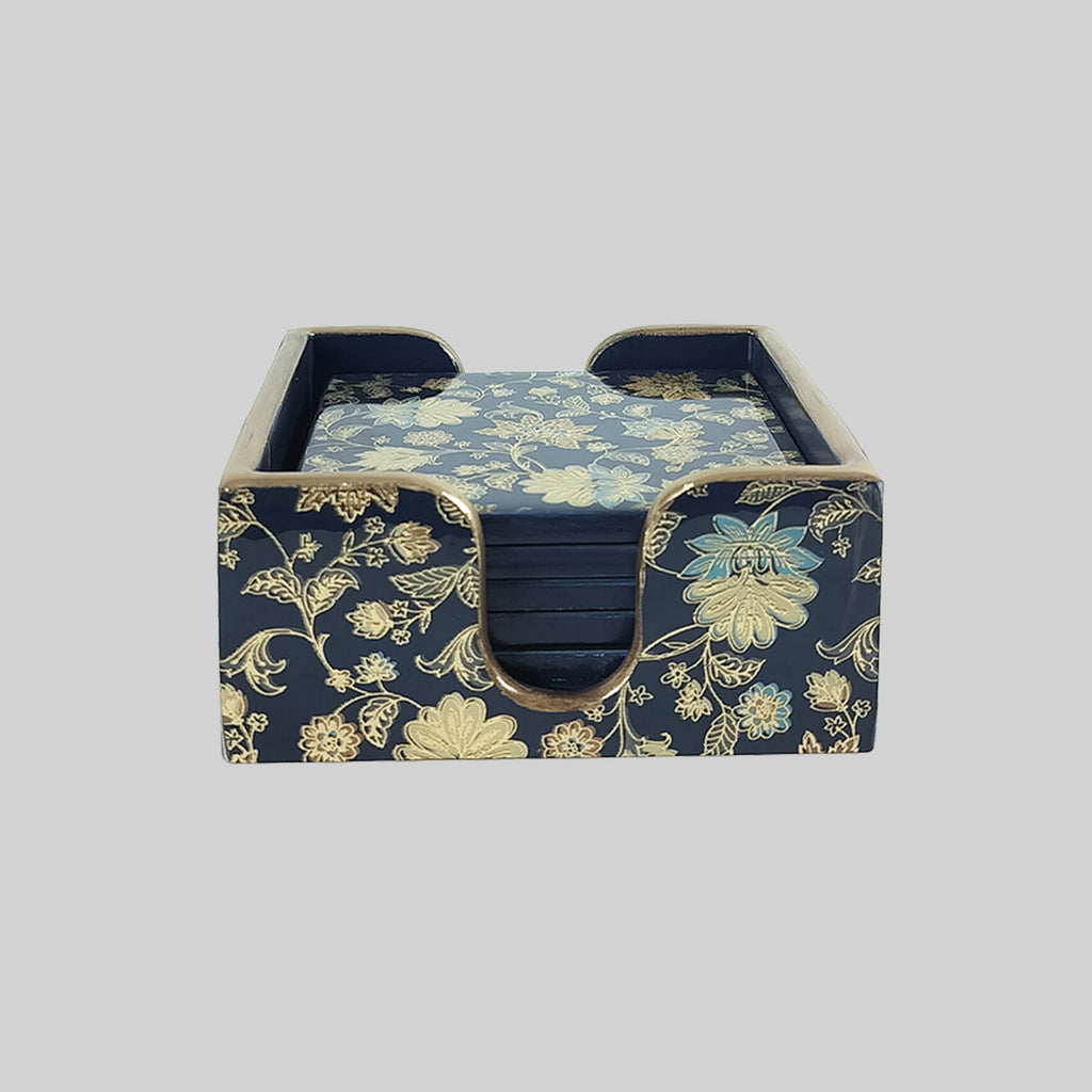 Navy Floral Gold Foiled Square Coasters with Holder (Set of 6)