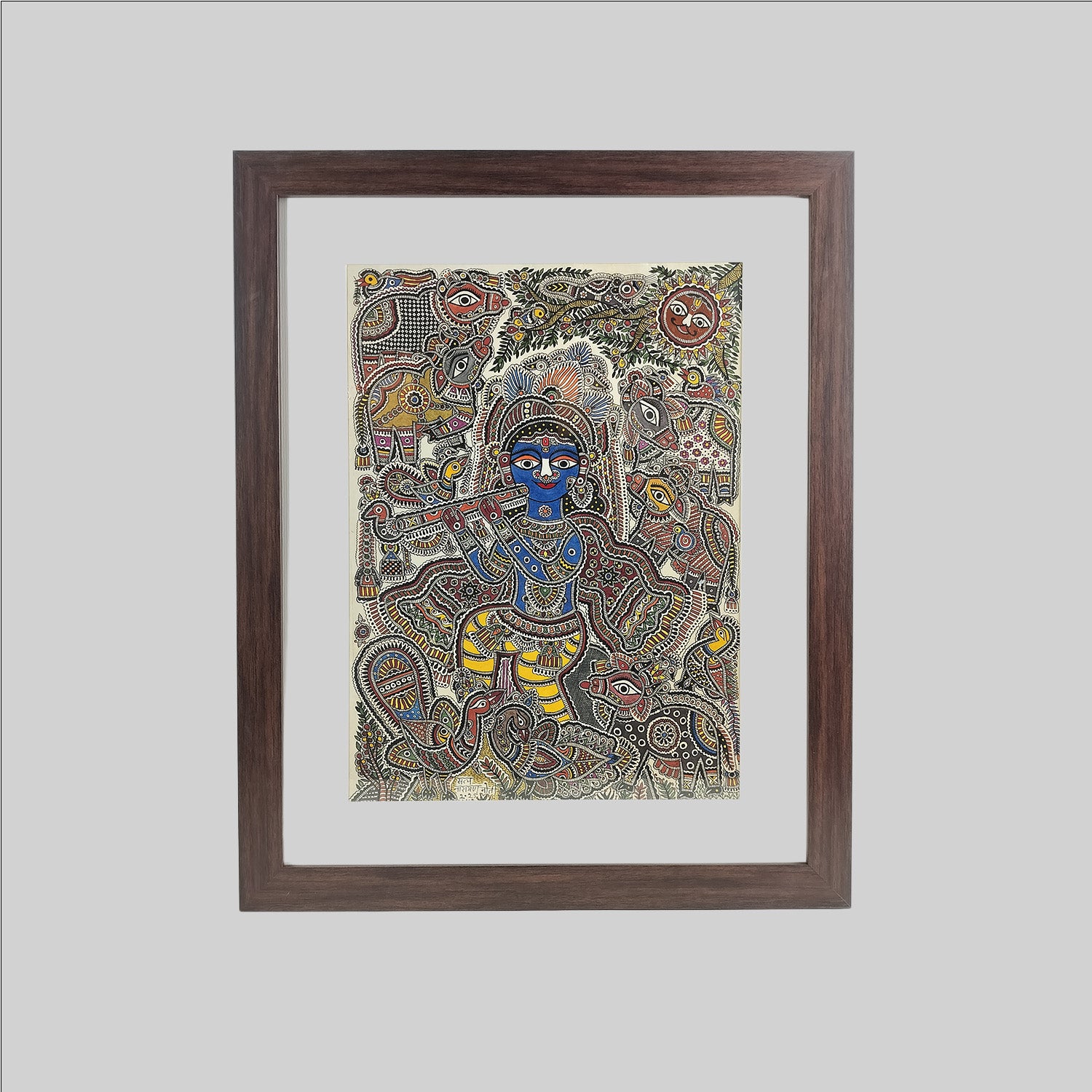 Madhubani Krishna in Vrindavan Painting (Frame) - 11 in x 15 in