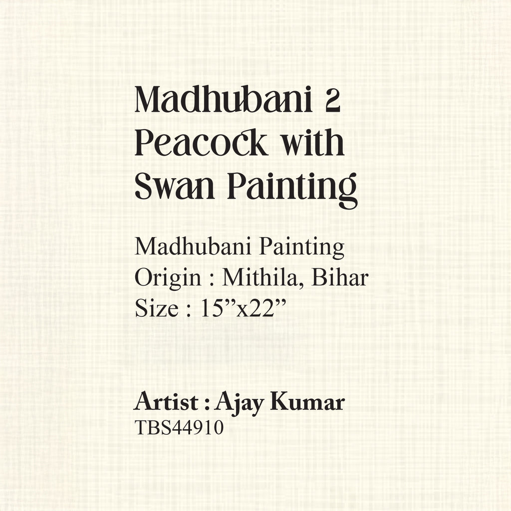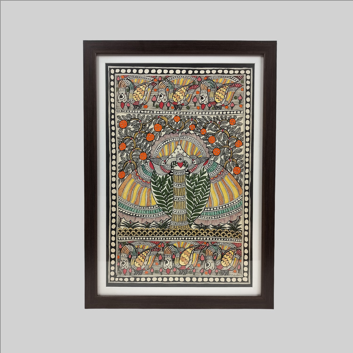 Madhubani Peacock with Swan Painting (Frame) - 15 in x 22 in