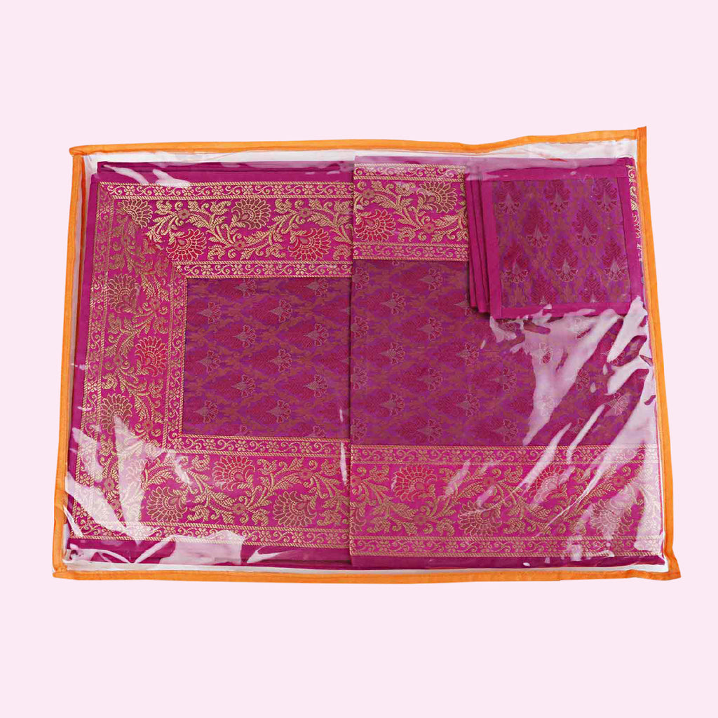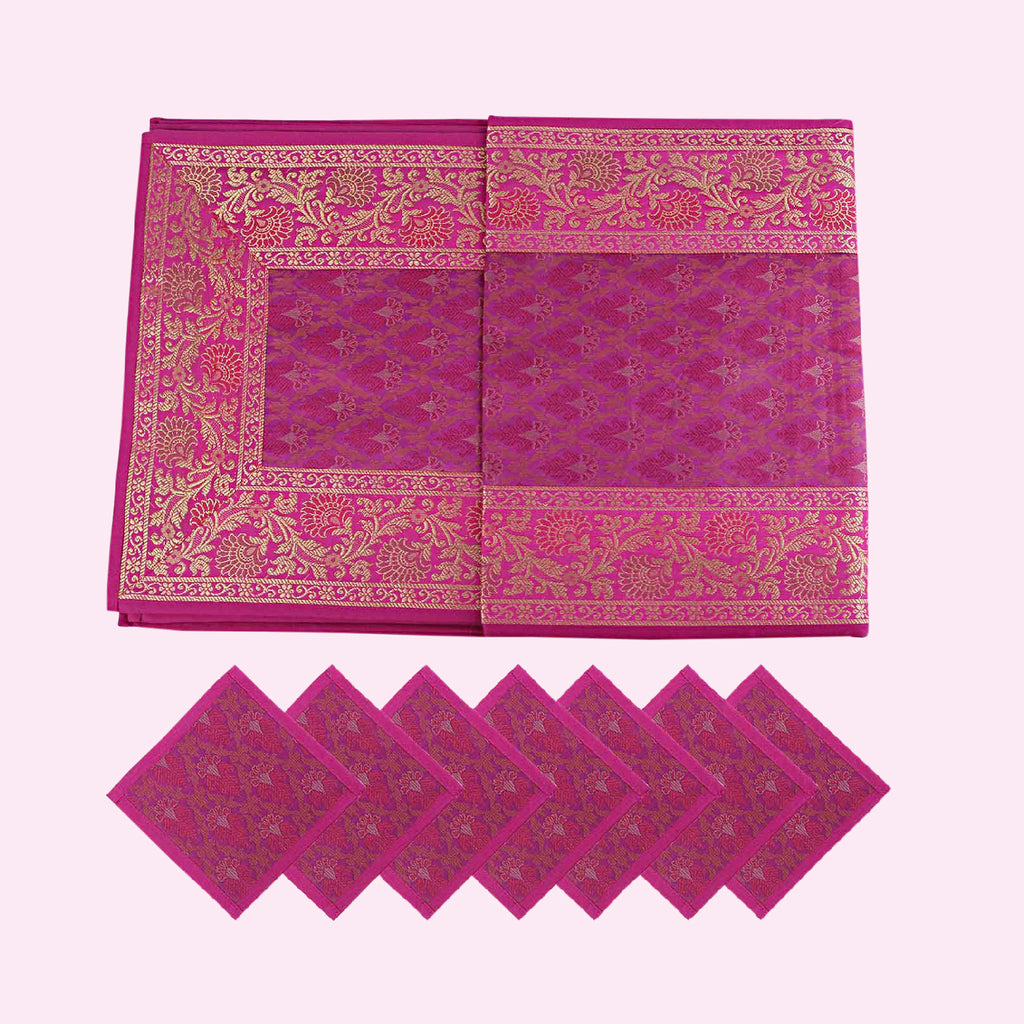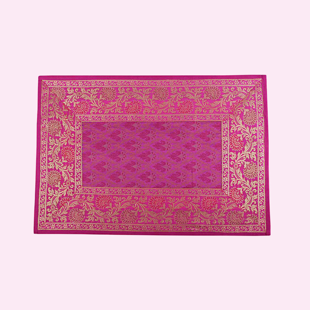 Made with Art Silk and Brocade, this table set lends a royal touch to your decor. The Indian motifs on brighter hues with interwoven golden brocade make for a beautiful table setting. This elegant set is a gifting favourite too.