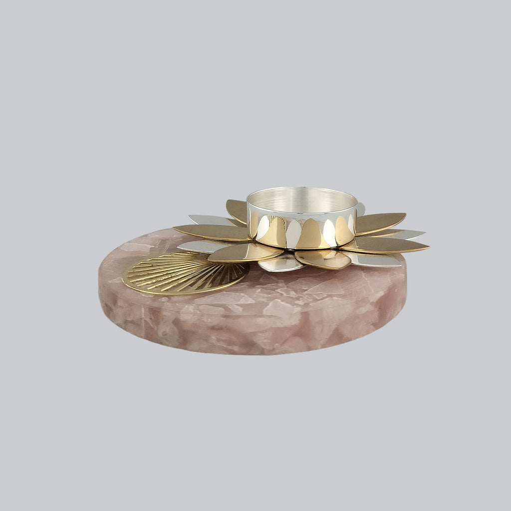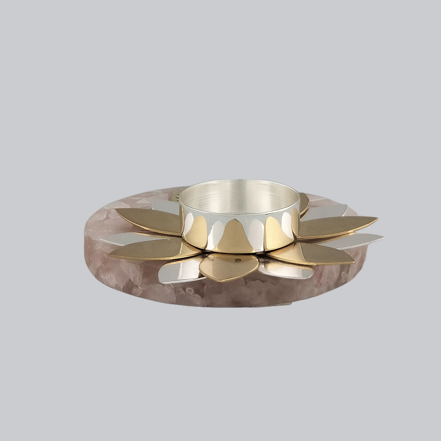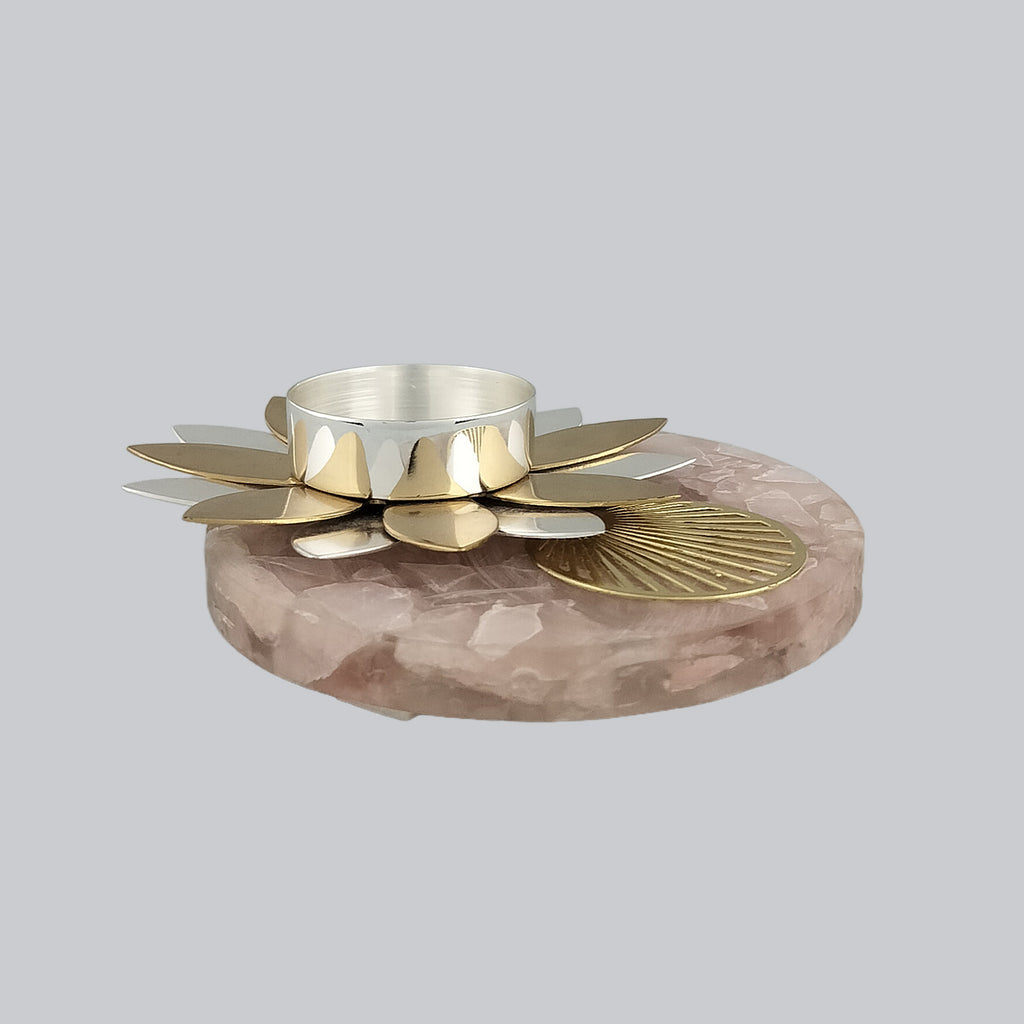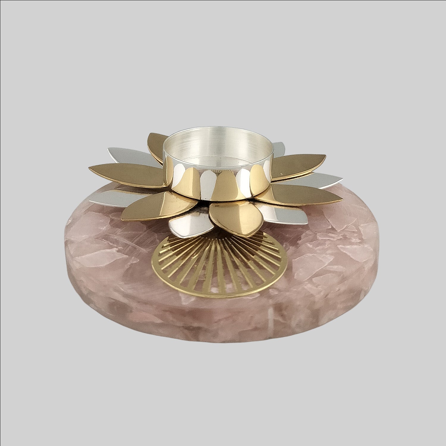 Silver & Gold Plated Flower T Light Holder on Rose Quartz Base 5.5 in x 4.5 in