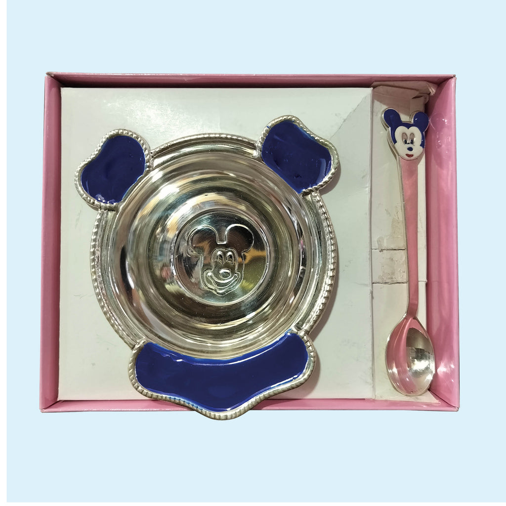 Silver Blue Plate & Spoon with Mickey Mouse Design 106 gm