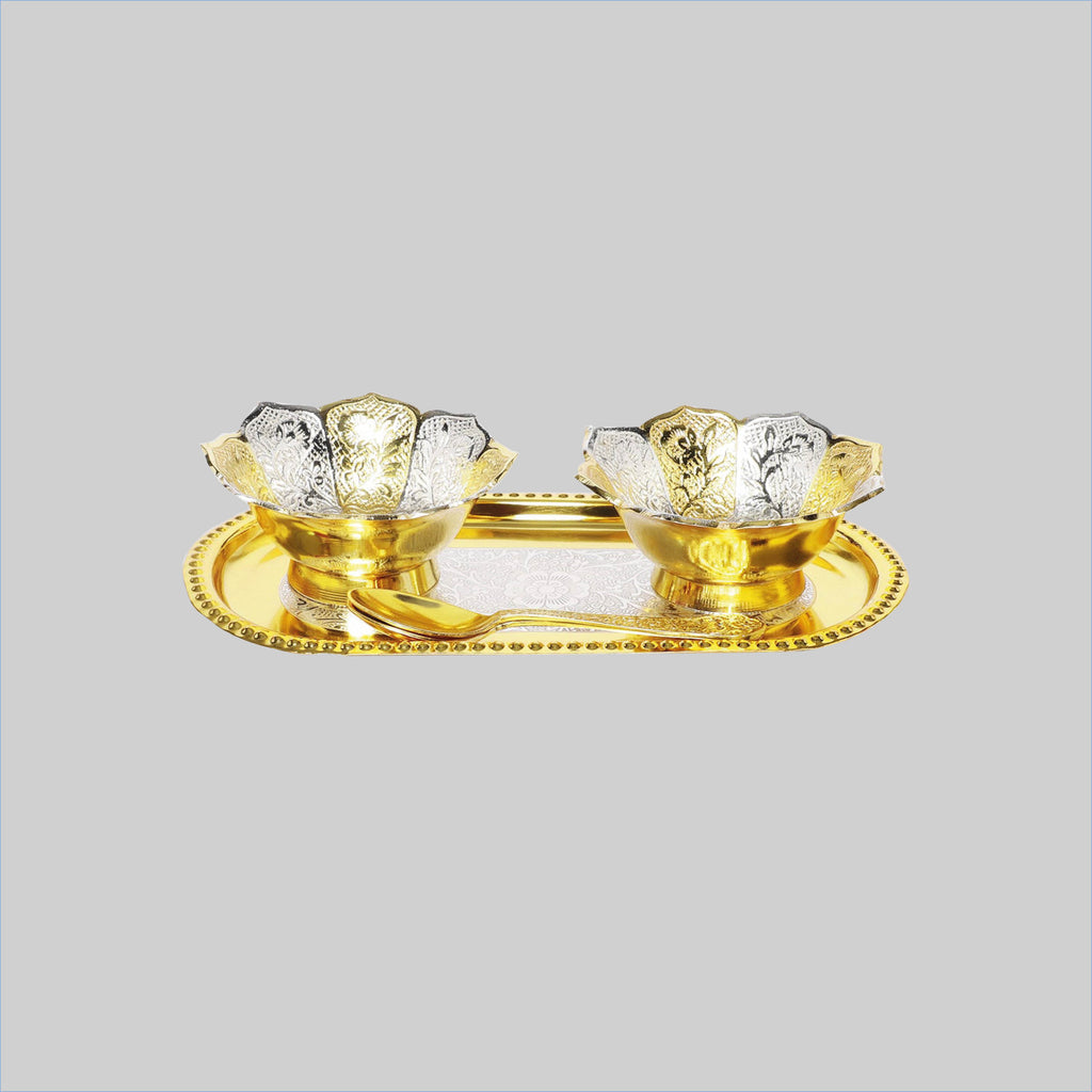 Brass Bowl, Tray and Spoon Set in Gold and Silver Plating