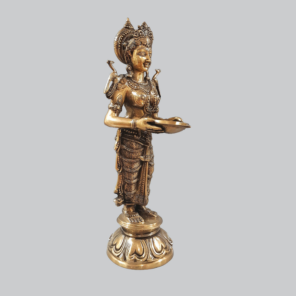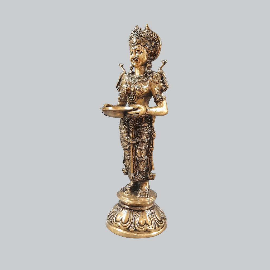 Invite prosperity and positive energy into your home with our beautifully handcrafted Brass Deep Laxmi. Featuring Goddess Laxmi holding a traditional deepak, this piece symbolizes wealth, light, and divine blessings. Made from pure brass with intricate detailing, it's perfect for Diwali, Lakshmi Pooja, or as a sacred addition to your spiritual décor. A timeless blend of devotion and artistry, ideal for gifting or enhancing your home temple.