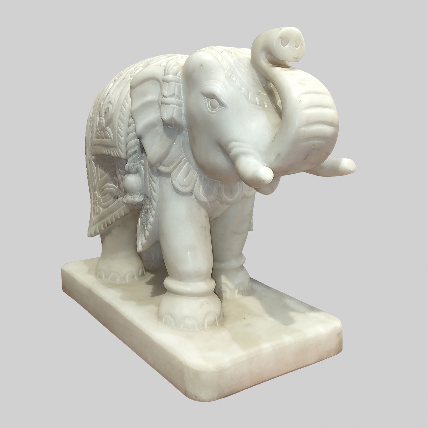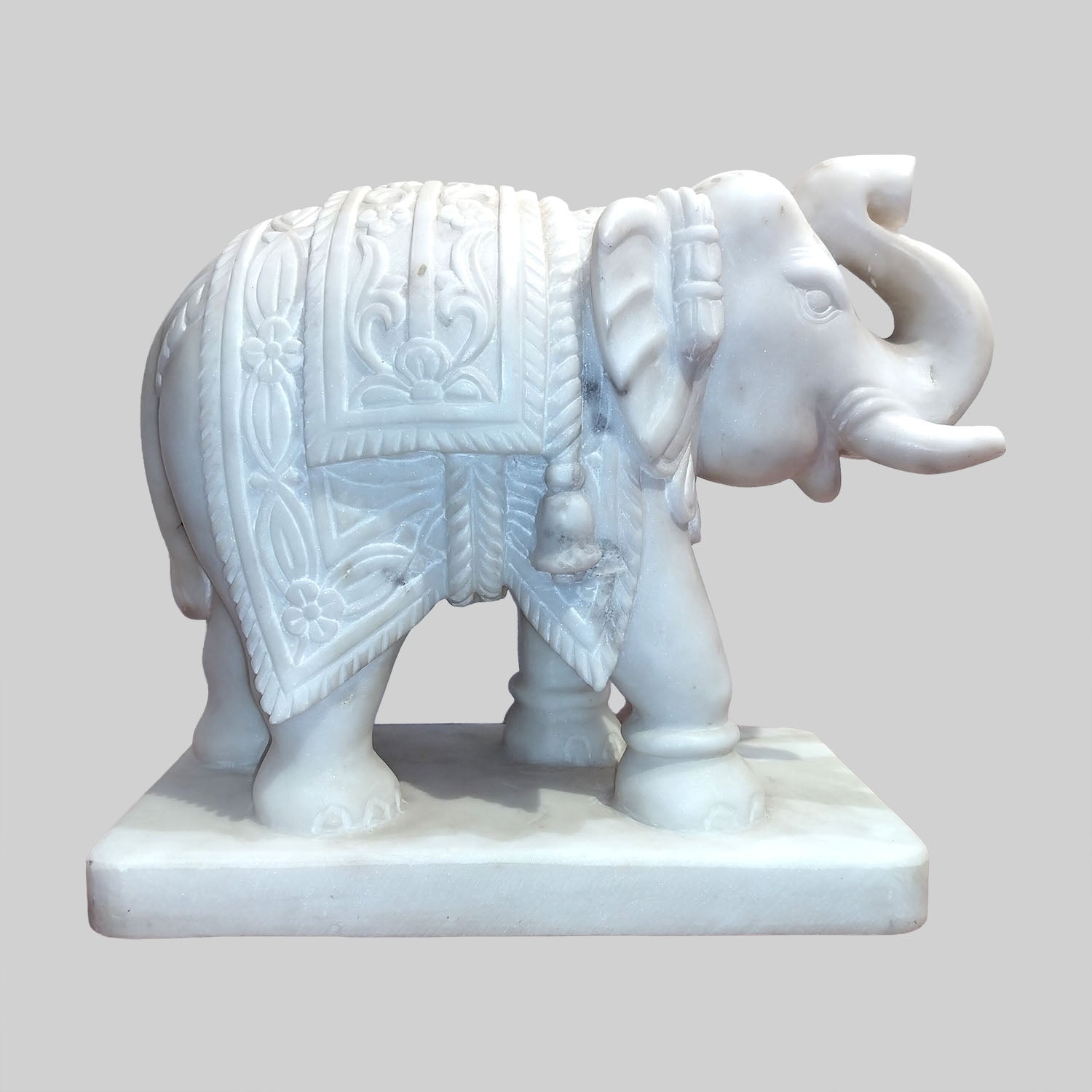 Marble Elephant with Flower Carving Up Trunk 15 in